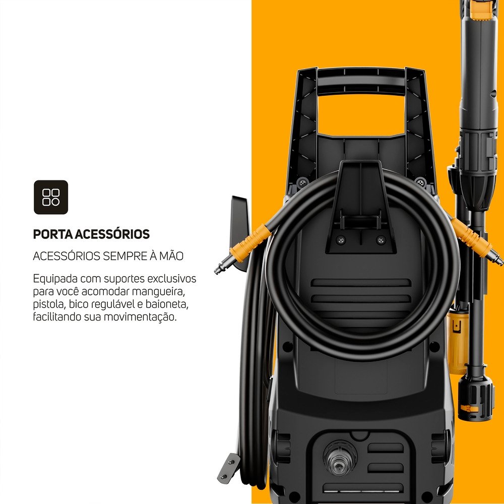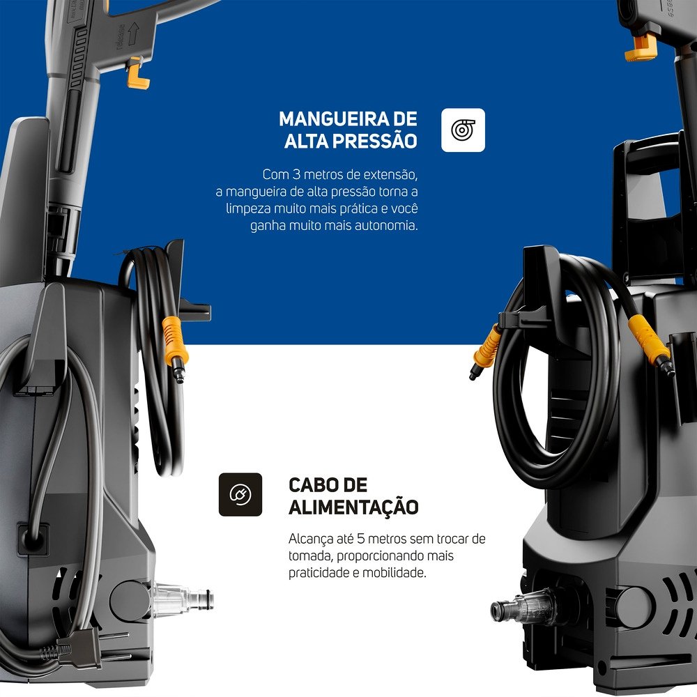 Alcança até 5 metros sem trocar de tomada 3 metros de extensão, a mangueira de alta pressão torna a limpeza muito mais prática e você ganha muito mais autonomia.
