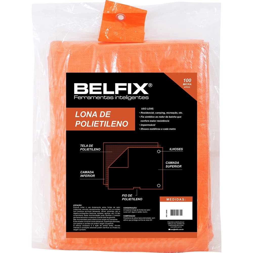 Uso leve; Indicada para agricultura, construção civil, náutica, camping, pesca, recreação, utilidades domésticas entre outros; Espessura aproximada: 100 micras; Fio sintético ao redor da bainha para maior resistência; Em polietileno de alta e baixa densidade, com aditivo que protege contra os raios ultravioletas, Ilhoses metálicas a cada 1 metro.