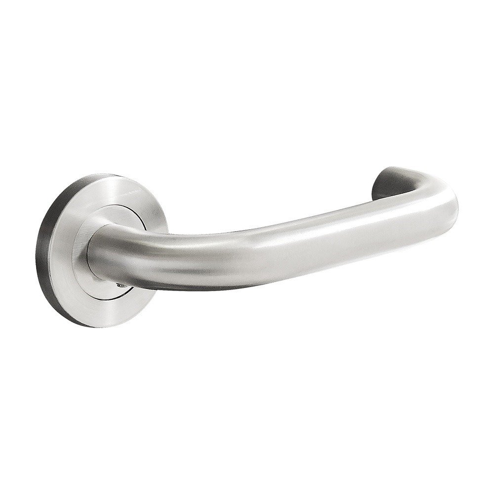 Par de maçaneta tubulares redondas de aço inoxidável 304 com as respectivas rosetas redondas com 52mm de diâmetro e 8mm de altura, com mola interna de reforço.