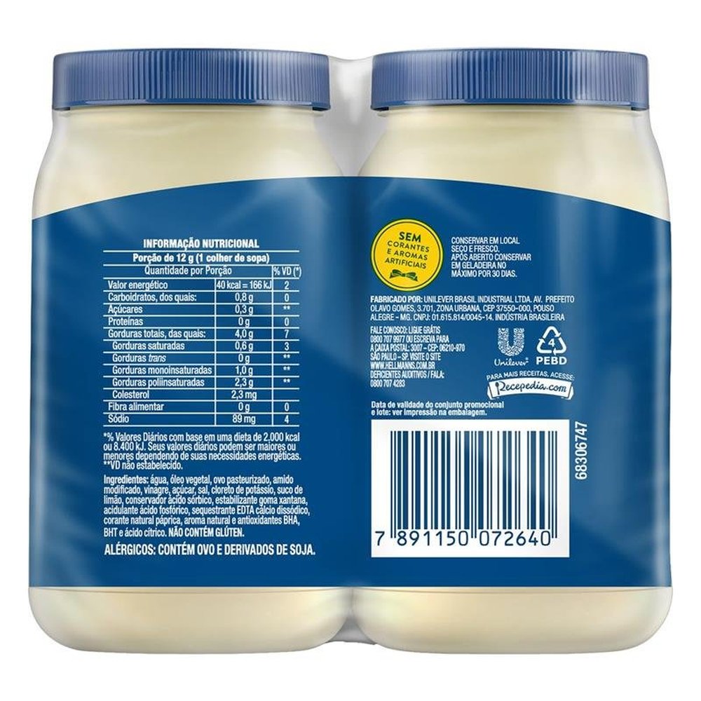 A Maionese Hellmann¿s pack com 2 potes de 500g é uma versão econômica da tradicional maionese da marca, conhecida pela sua textura cremosa e sabor equilibrado. Esse formato ¿leve mais por menos¿ é ideal para famílias ou para quem utiliza o produto com frequência.