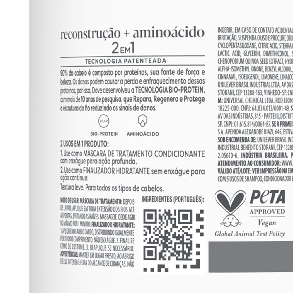 Como finalizador hidratante: aplique no cabelo úmido, distribuindo igualmente por todo o comprimento. Não enxágue. Finalize como de costume e reaplique se necessário. Para melhores resultados, utilize a linha completa Dove Reconstrução + Aminoácido