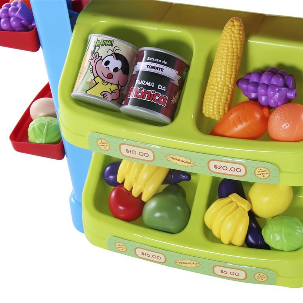 Mercadinho turma da mônica Acessórios: 1 caixinha de balas - 1 caixinha de cookies - 1 caixinha de cupcake - 1 caixinha de pipoca - 1 carrinho de feira - 1 caixa registradora - 2 latas de suco - 1 garrafinha de suco de laranja - 1 garrafinha de suco de melancia - 1 garrafinha de leite - 1 garrafinha de achocolatado - 2 abacates - 2 cachos de uva - 2 berinjelas - 1 espiga de milho - 2 ovos - 1 maçã - 2 limões - 2 cenouras - 2 cachos de banana - 2 repolhos - 1 laranja - 3 dinheirinho nota de 5 - 3 dinheirinho nota de 10 - 3 dinheirinho nota de 25
