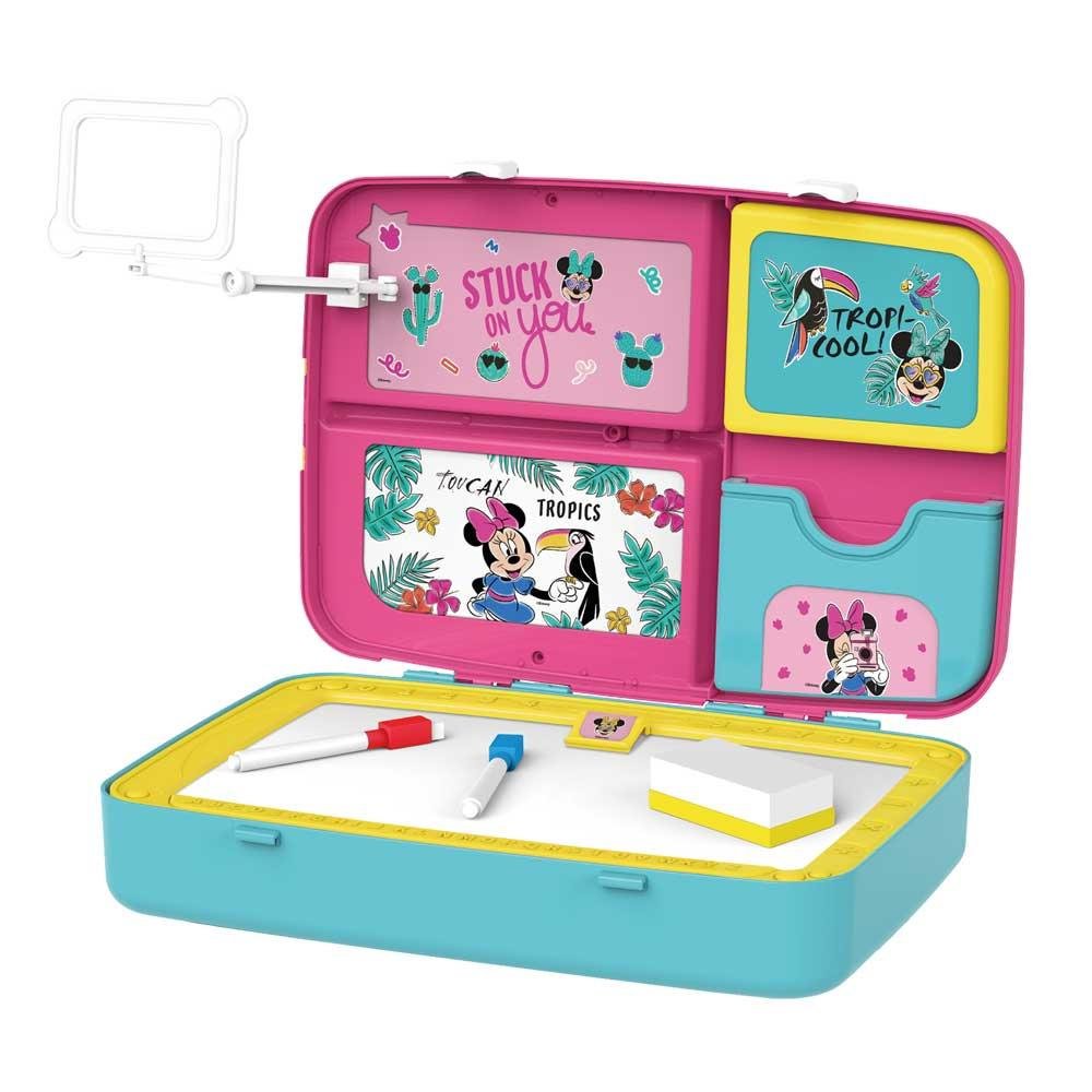 Ao abrir a mochila, descubra diversos acessorios inclusos, como letras e simbolos em imãs, canetas, giz e apagador, cards da Minnie e muito mais.
