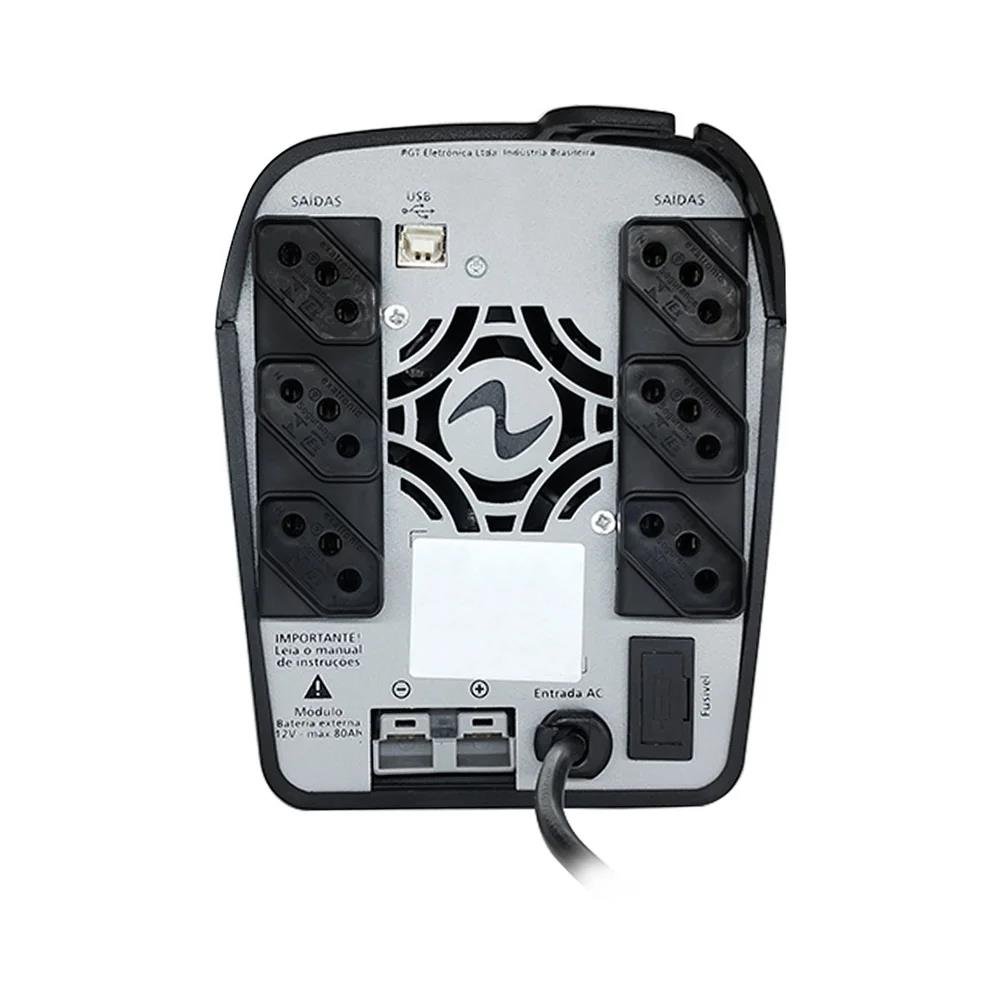 Com tecnologia Line Interactive Senoidal Pura conforme a norma NBR 15014, é ideal para computadores, servidores, PDVs, videogames, home theaters, TVs e dispositivos de rede. Conta com 6 tomadas protegidas, entrada trivolt automática (115V/127V/220V) e saída fixa em 115V. Sua bateria interna garante partida mesmo sem energia elétrica (DC Start), e a recarga inteligente permite restabelecimento em até 8 horas (80% da capacidade). Além disso, o modelo oferece proteções eletrônicas completas contra surtos, sobrecarga, curto-circuito e subtensão/sobretensão, além de recursos exclusivos como Powerlook Battery Save, que preserva a vida útil da bateria. Principais Características Potência nominal: 700VA Fator de potência: 0,7 (¿ 490W) Entrada: Seleção automática (115V / 127V / 220V) Saída: 115V fixa Tomadas de saída: 6x NBR 14136 Forma de onda: Senoidal pura (True RMS) Tempo de acionamento do inversor: 0,8 ms Regulação em modo rede: -6% / +6% (NBR 14373) Rendimento: >95% (rede) / >85% (inversor) Recarga da bateria: até 8h (80% de carga) Tecnologia: Line Interactive Senoidal Indicadores: LEDs para status de bateria e carga Funções extras: DC Start: partida mesmo sem energia elétrica Auto-partida: religamento automático após retorno da rede Chave liga/desliga temporizada com função MUTE Powerlook Battery Save (evita descarga desnecessária ¿ modelos USB/CBU) Troca fácil de bateria pelo usuário Conexão para bateria externa (CBU) Interface USB para gerenciamento (modelos CBU/USB) Proteções Integradas Contra sobrecarga, curto-circuito e sobretemperatura Contra sub e sobretensão da rede elétrica Contra descarga total da bateria Filtro de linha para distúrbios elétricos Varistores de ação rápida contra surtos e descargas atmosféricas Estabilizador interno com 11 estágios de regulação (modelos TI) Aplicações Recomendadas ¿ Computadores / PC Gamer / Fontes com PFC Ativo