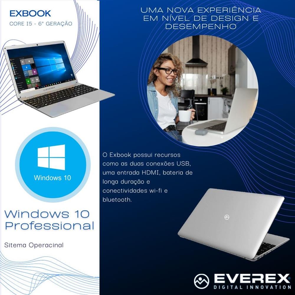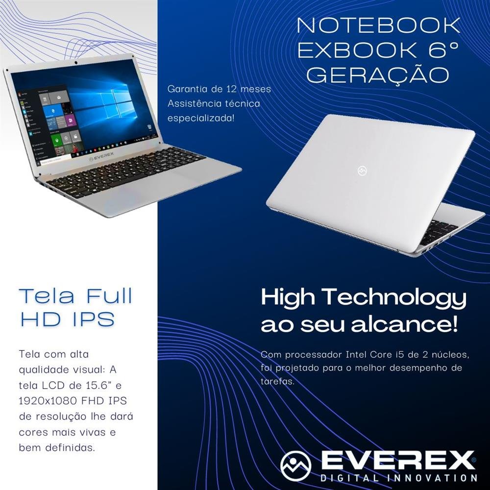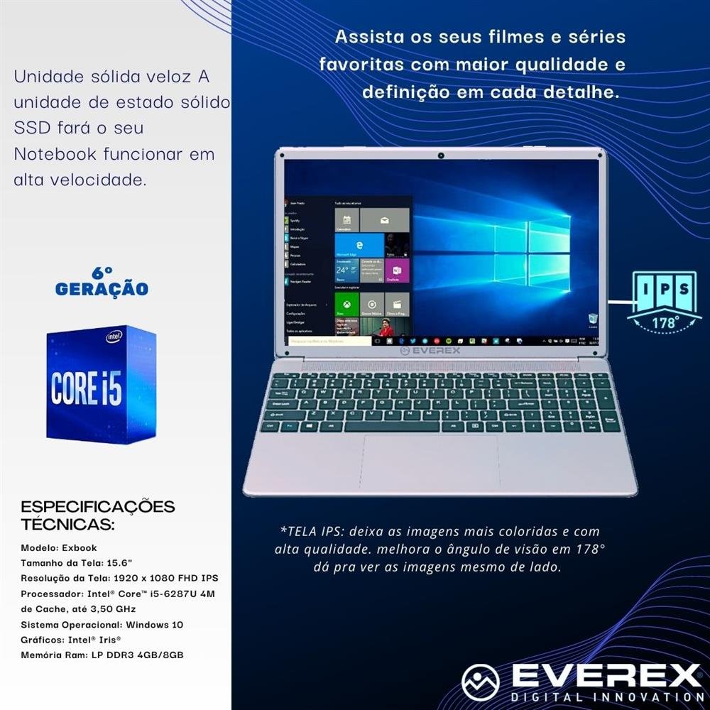EVEREX Digital Innovation Notebook Intel Core i5, Tela 15.6¿ Full HD IPS, 8GB, 1TB SSD e Windows 10 - Everex Nós somos a EVEREX , comprometidos com o desenvolvimento de produtos de alta tecnologia e qualidade para você. Aproveite o melhor da tecnologia, com a nova linha de Notebooks 6° Geração da Everex, você terá uma nova experiência em nível de design e desempenho, tanto para o uso diário quanto para uso profissional. CARACTERÍSTICAS: Tela com alta qualidade visual: A tela IPS de 15.6" Full HD e 1920x1080 de resolução lhe dará cores mais vivas e bem definidas. Diferente das telas LCD's convencionais, a Tela com tecnologia IPS deixa as imagens mais coloridas e com Alta qualidade. Além disso ela melhora o ângulo de visão, dá pra ver as imagens em alta resolução independente do ângulo que você estiver olhando! Assista os seus filmes e séries favoritas com maior qualidade e definição em cada detalhe! Alta Tecnologia ao seu alcance, O processador Intel Core i5 de 2 núcleos, foi projetado para o melhor desempenho de tarefas. Com esta unidade central de processamento o seu realizará vários processos simultaneamente, desde a edição de vídeo até o uso de programas profissionais. Unidade sólida veloz, A unidade de estado sólido SSD fará o seu Notebook funcionar em alta velocidade e por isso oferece uma maior agilidade para operar com diversos programas. O também conta com outros recursos como as duas conexões USB, uma entrada HDMI, bateria de longa duração e conectividades wi-fi e bluetooth. O Notebook vem equipado com sistema operacional Windows 10 para garantir mais praticidade no seu dia a dia.] ESPECIFICAÇÕES TÉCNICAS: Marca: Everex