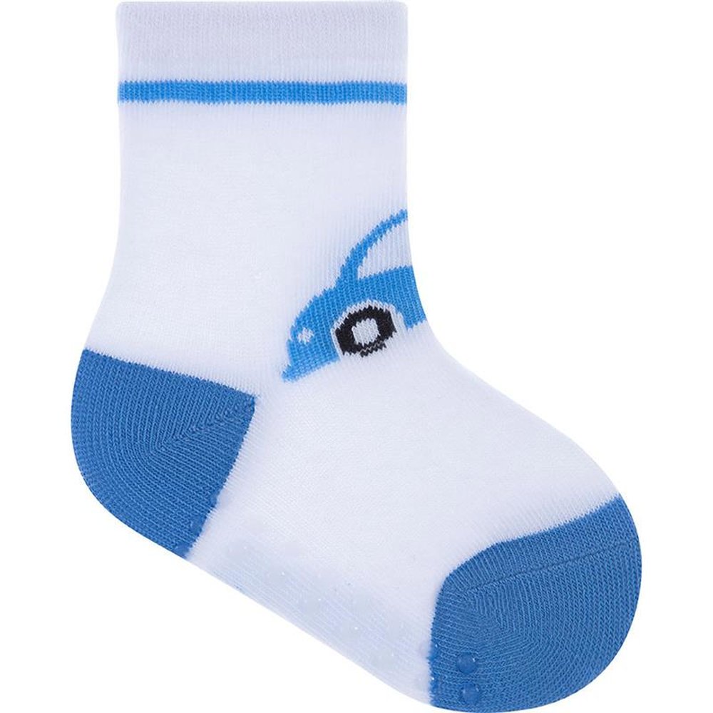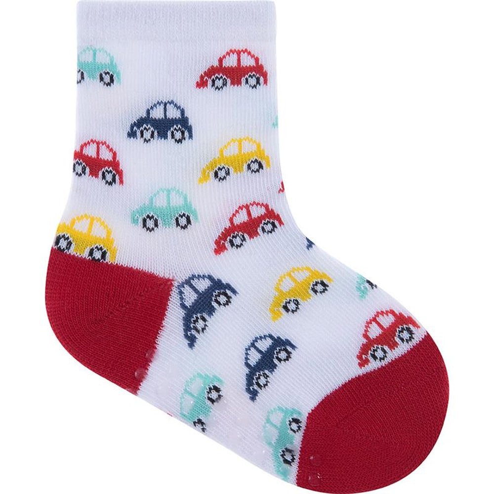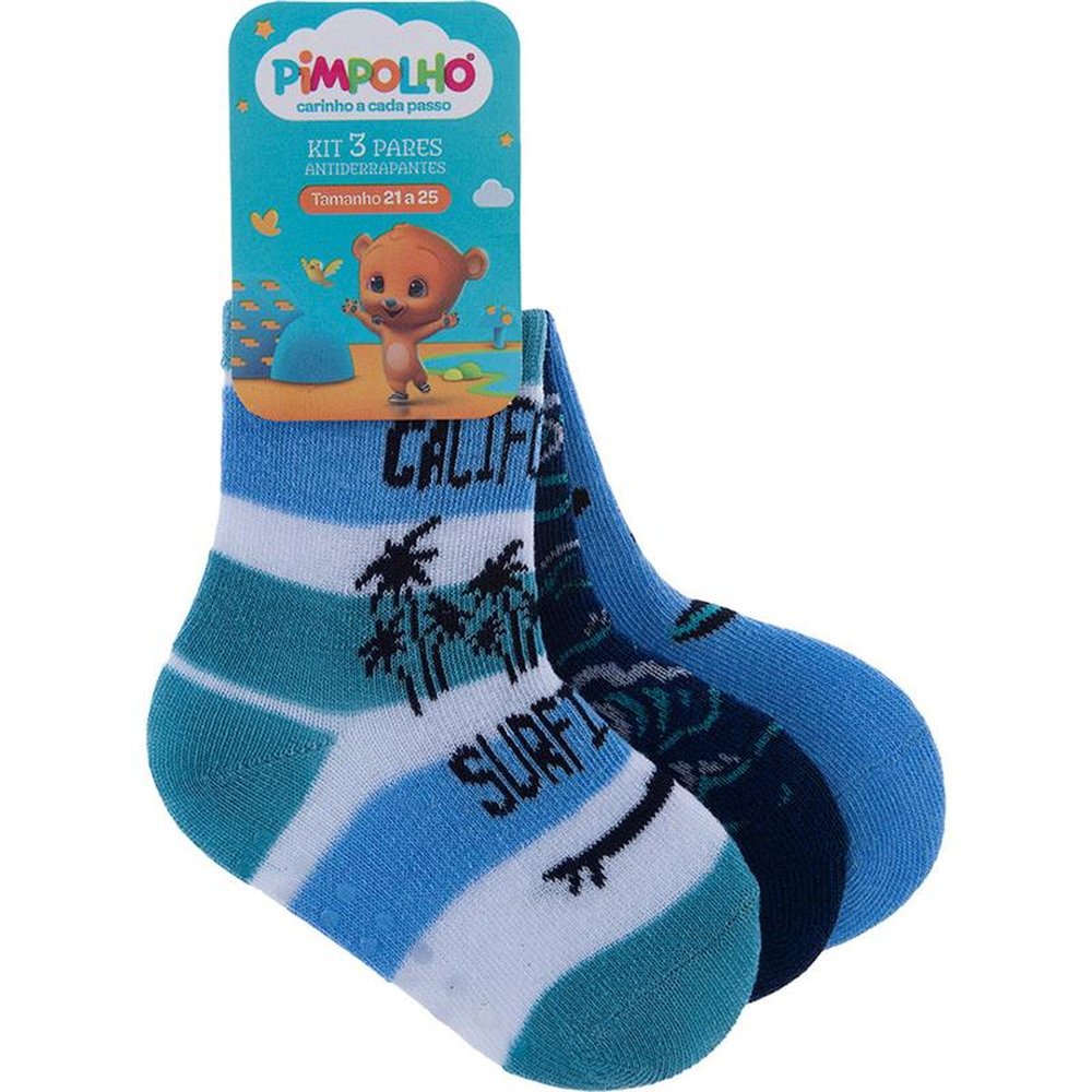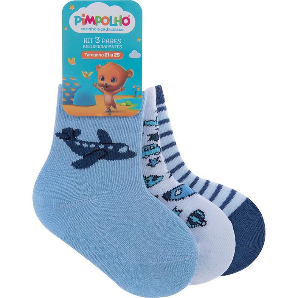 Caixa com 6 kits de 3 pares cada, sendo 2 (marinho ondas, azul surf, branco listrado), 2 (marinho listras, azul aviao, branco carros) e 2 (branco carro, branco carros, amarelo listras). Meias coloridas, sendo 3 pares em um tag temático, com estampas coloridas e divertidas. Para maior durabilidade, ler as instruções de lavagem na embalagem.