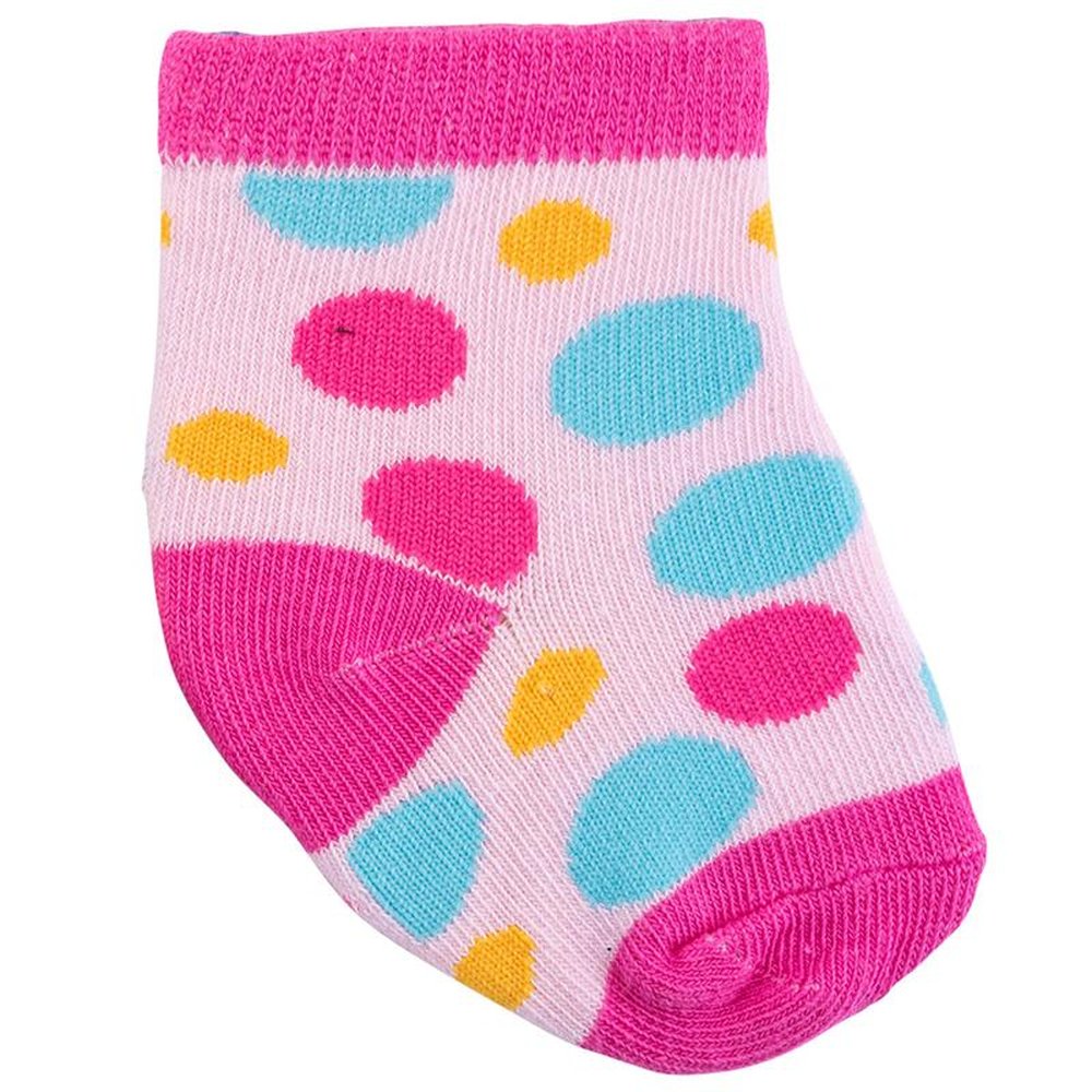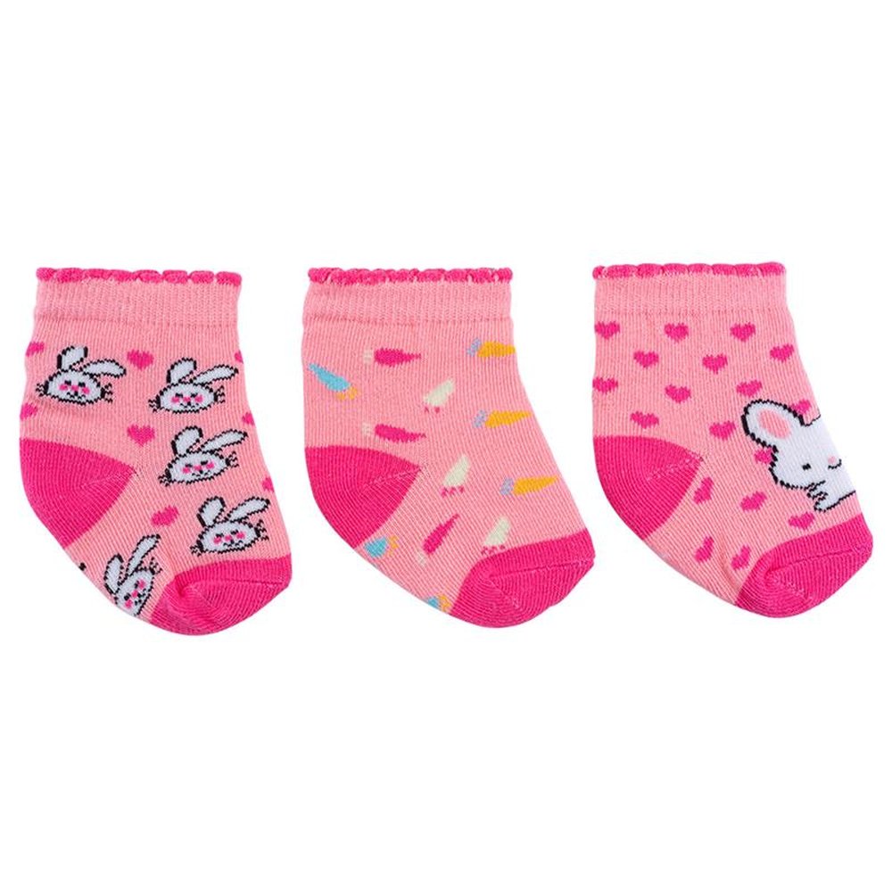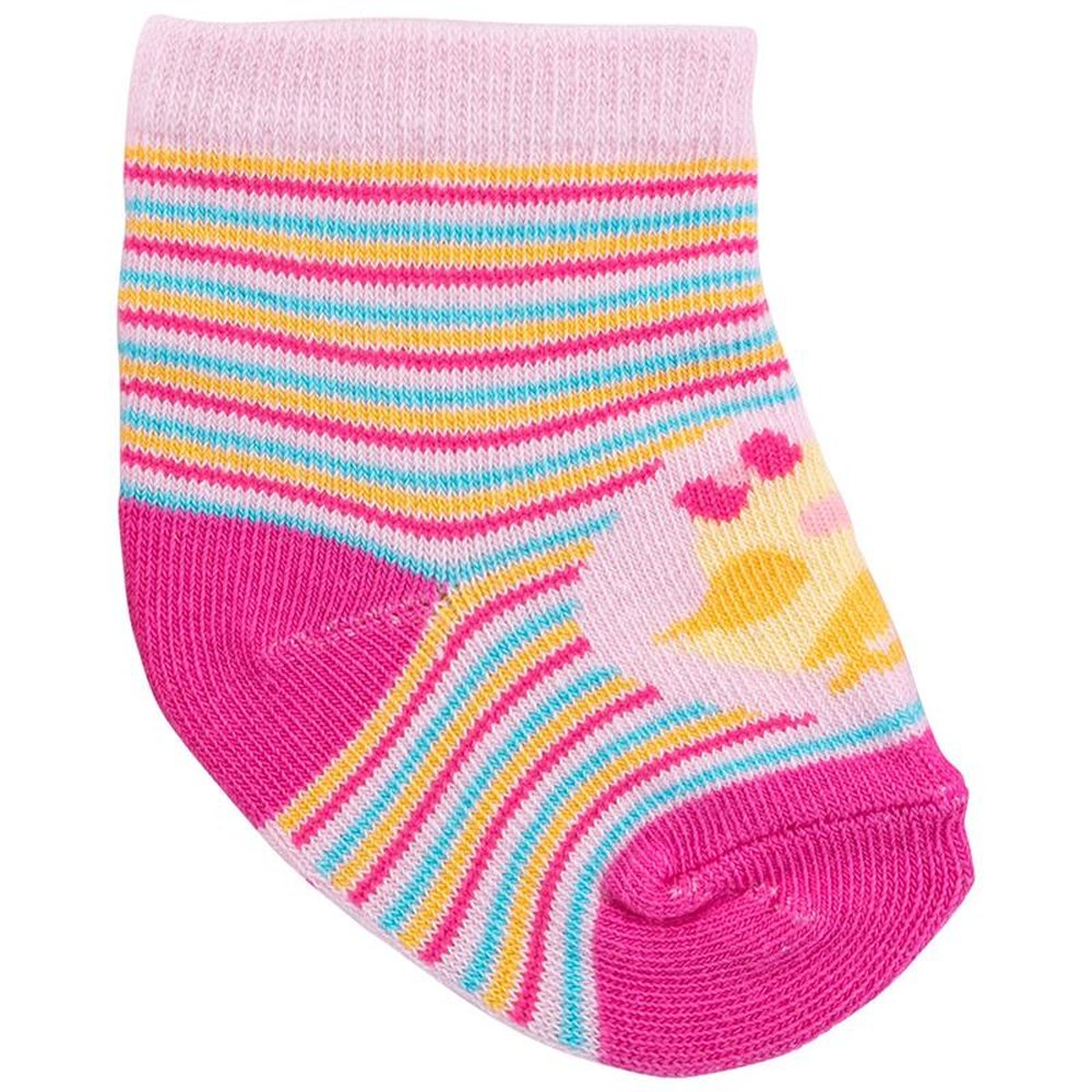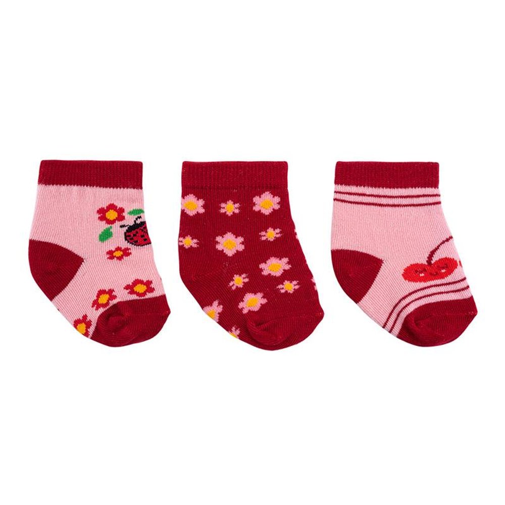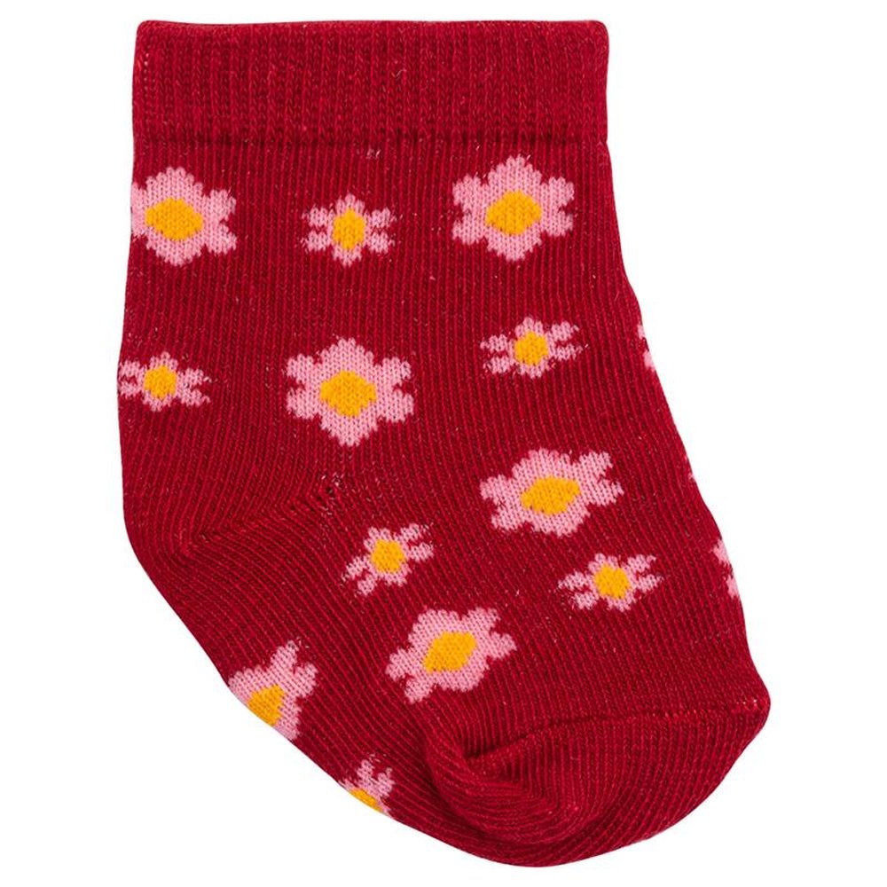 Polibag com 6 kits de 3 pares cada, sendo: 2 Xadrez Rosa/Passarinho Rosa/Bolas Rosa, 2 Joaninha Vermelha/Flor Vermelha/Cereja Vermelha e 2 Cenoura Rosa/Coelho Rosa/Corações Rosa. Meias coloridas, sendo 3 pares em um tag temático, com estampas coloridas e divertidas. Para maior durabilidade, ler as instruções de lavagem na embalagem.