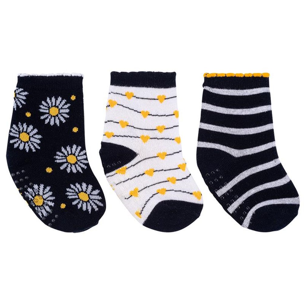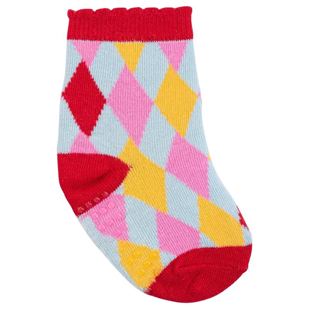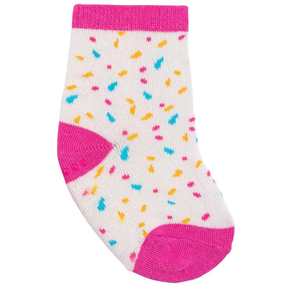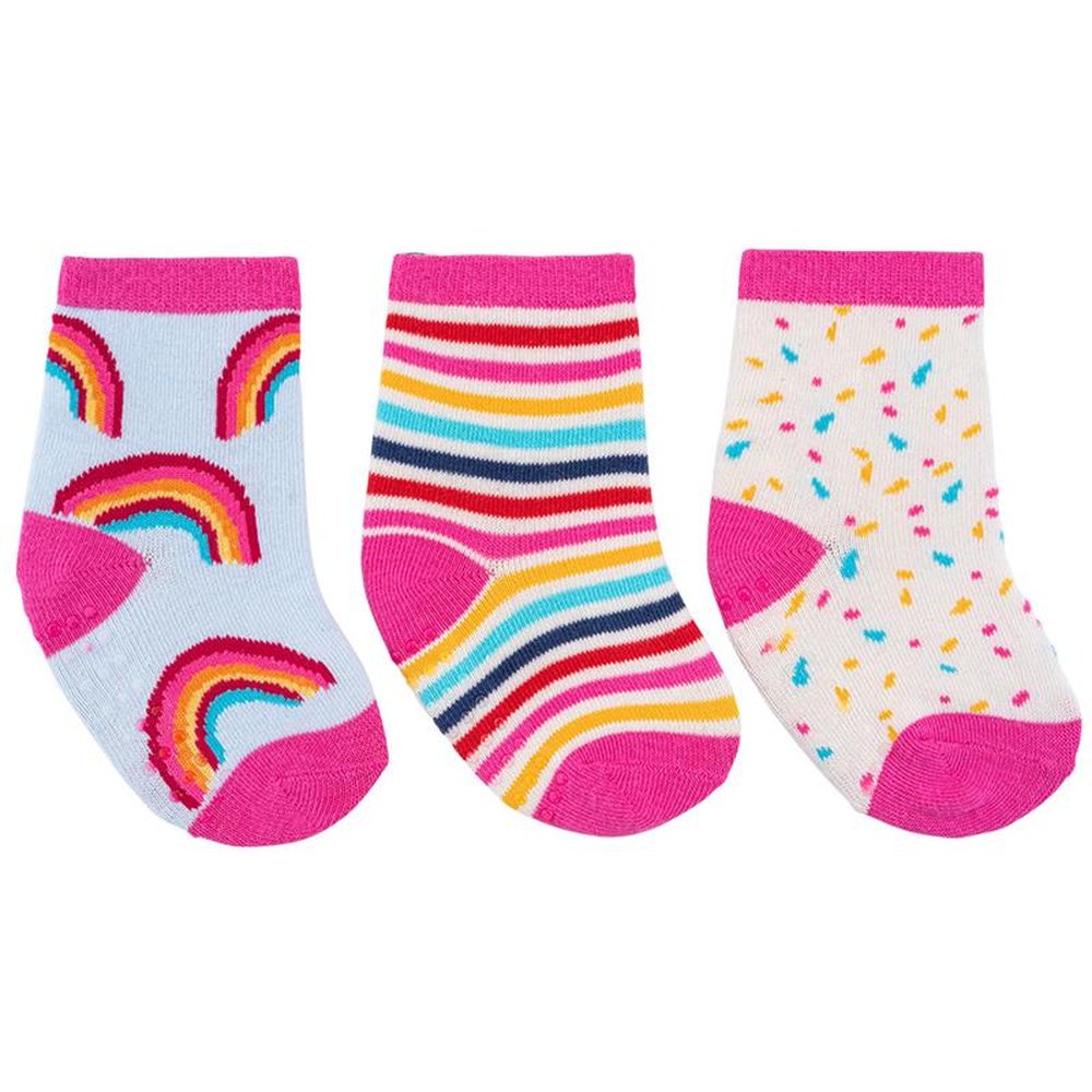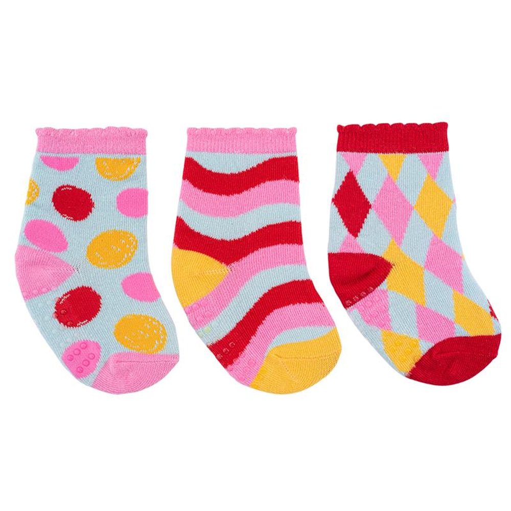 Polibag com 6 kits de 3 pares cada, sendo: 2 Onda Rosa/ Bolas Rosa/ Losangulo Vermelho, 2 Arco-Iris Azul/ Confeti Amarelo/ Listras Rosa e 2 Margarida Azul/Listra Azul/ Corações Amarelo. Meias coloridas, sendo 3 pares em um tag temático, com estampas coloridas e divertidas. Para maior durabilidade, ler as instruções de lavagem na embalagem.