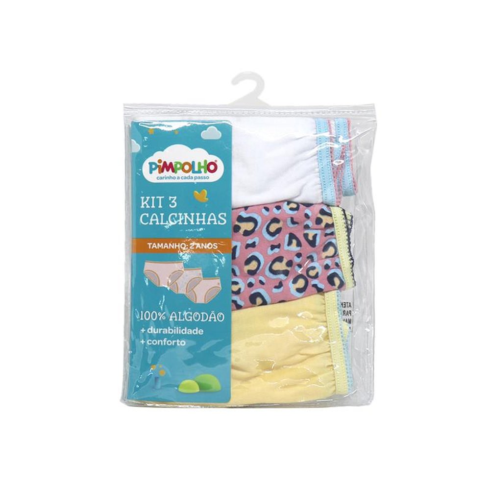 Polybag com 6 kits, sendo 2 Azul/Branco/Rosa, 2 Rosa/Branco/Azul e 2 Branco/Rosa/Amarelo. O kit de calcinhas Pimpolho é composto por 3 peças com cores variadas e estampas exclusivas. Contam ainda com acabamento em elástico e forro em algodão, o que proporciona mais conforto e segurança na hora de usar. Sua pequena vai amar!
