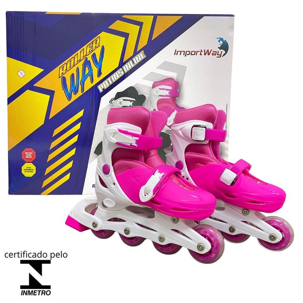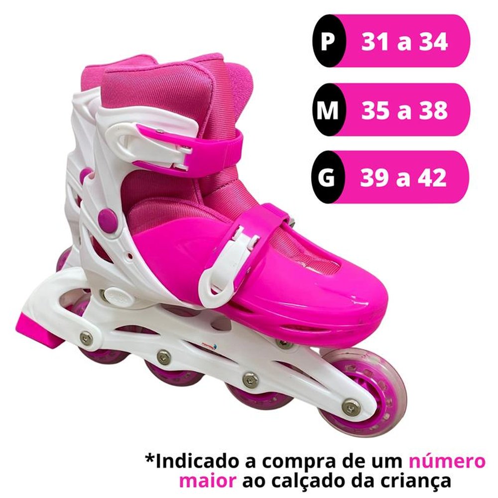 ¿ Sistema de configuração fácil ¿ 2 travas de segurança ¿ Freio traseiro no pé direito ¿ Rodas de 64mm no tamanhos P e M e 70mm no tamanho G ¿ Rolamento de aço ¿ Disponível nos tamanhos P (nº 31 a 34), M (nº 35 a 38) e G (nº 39 a 42) ¿ Acompanha capacete, joelheira, cotoveleira e luvas ¿ Indicada compra de um número maior ao calçado pela criança ¿ Produto certificado pelo INMETRO