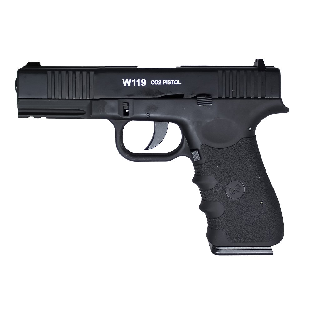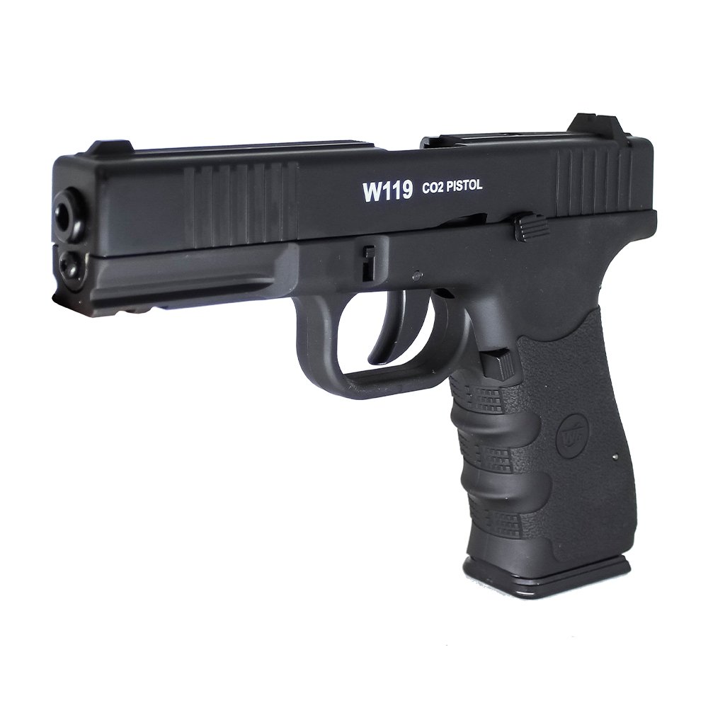 A Pistola de Pressão Rossi Wingun W19 CO2, calibre 4,5 mm, apresenta slide em metal e coronha em polímero, oferecendo construção robusta e acabamento realista; equipada com sistema de blowback que proporciona alto realismo ao simular o recuo, dispara esferas de aço 4,5 mm a cerca de 135 m/s (442 fps) em tamanho e escala reais, opera em modo semiautomático e conta com trava de gatilho, alça e massa de mira fixa para maior segurança e precisão, sendo ideal para treino, colecionismo e prática avançada.