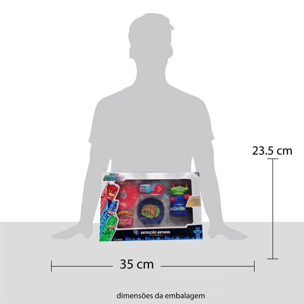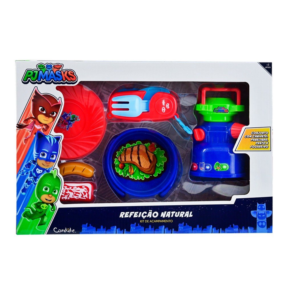 A turma da PJ Masks - o Menino Gato, a Corujita e o Lagartixo - estão em uma nova divertida aventura! Eles vão ter que acampar para poder resgatar um de seus amigos! E com o PJ Masks - Camping - Refeição Natural você pode acampar com eles para ajudar a ¿vencer o mal¿! O PJ Masks - Camping - Refeição Natural acompanha marmiteira, prato e talheres e fogareiro, que realmente acende luz e tem um botão que regula os leds para simular fogo de verdade! Com um design único inspirado pelos seus personagens favoritos. A brincadeira vai ficar muito mais legal com o PJ Masks - Camping - Refeição Natural. Dimensões: AxLxC = 23,50 x 35,00 x 08,50cm e Peso Liquido 500 gramas