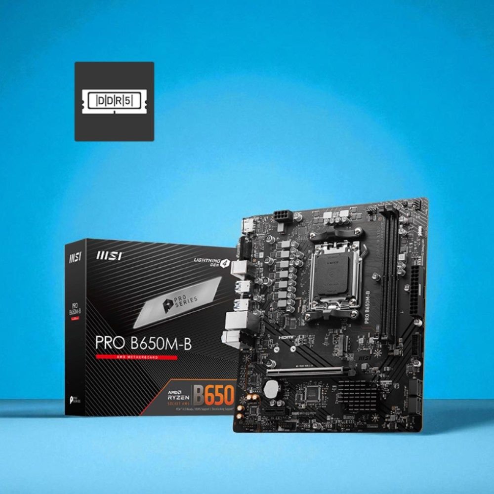 Placa-Mãe MSI PRO B650M-B AM5 mATX DDR5 A MSI PRO B650M-B faz parte da linha PRO, projetada para oferecer desempenho, estabilidade e eficiência no dia a dia, seja para produtividade, multitarefas ou aplicações profissionais. Compatível com a nova geração de processadores AMD Ryzen¿, entrega suporte às memórias DDR5 de alta velocidade, conectividade moderna e recursos de expansão que garantem excelente custo-benefício. Principais Características Compatível com processadores AMD Ryzen¿ série 9000 / 8000 / 7000 (AM5) Suporte a memórias DDR5 até 128 GB (frequência de até 6800+ MHz via OC) Formato mATX compacto, ideal para gabinetes menores Slot PCIe 4.0 x16 para placas de vídeo de alto desempenho Armazenamento híbrido com 1x M.2 PCIe 4.0 + 4x SATA 6Gb/s Rede de alta velocidade 2.5G LAN Realtek® Saídas de vídeo HDMI¿ 2.1 (4K@60Hz) e VGA Áudio de alta definição 7.1 canais (Realtek® ALC897) Especificações Técnicas