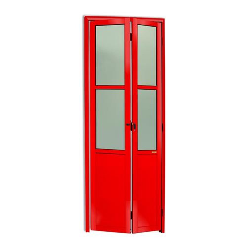 Portas de Abrir de Alumínio Linha L.25 Pintura Eletrostática Vermelho 2 Folhas de Sanfonar para o Lado Esquerdo Vidro Mini Boreal 4mm Lambris Horizontais na parte Inferior Trinco e Dobradiças na Cor do Produto Altura 210 Cm Largura 60 Cm Requadro 4,6 Cm Garantia de 5 anos contra defeitos de fabricação