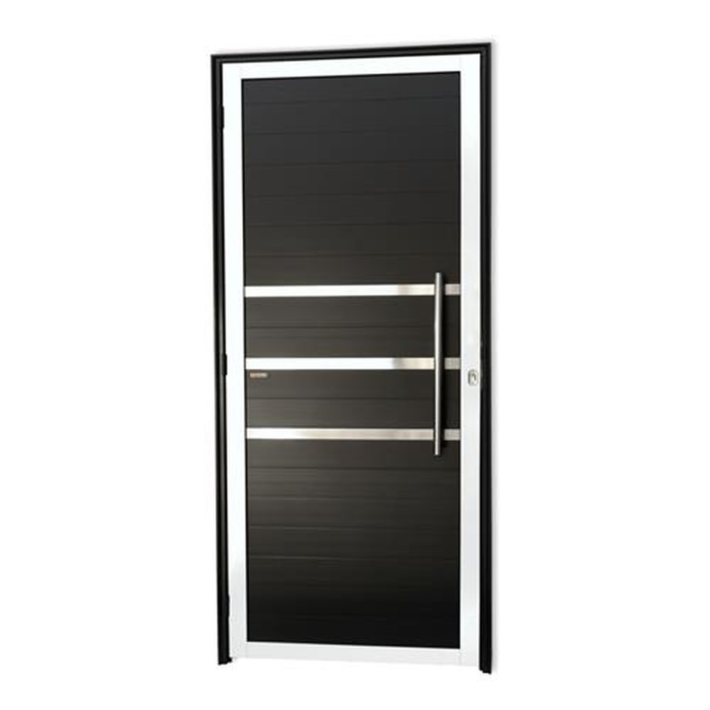 Portas de Abrir de Alumínio Linha Super 25 Pintura Eletrostática Mix Preta 1 Folha de Abrir para o Lado Direito Lambris Horizontais 3 Frisos Polidos e Envernizados Puxador Londres 60 Cm Polido Altura 210 Cm Largura 80 Cm Requadro 4,6 Cm Garantia de 5 anos contra defeitos de fabricação