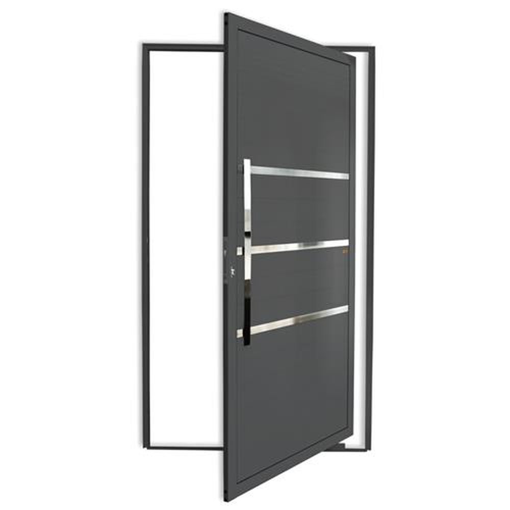 Porta Pivotante de Alumínio Linha Super 25 Pintura Eletrostática Cinza 1 Folha de Abrir para o Lado Esquerdo Lambris Horizontais 3 Frisos Polidos e Envernizados Puxador Dubai 80 Cm Polido Altura 210 Cm Largura 100 Cm Requadro 4,6 Cm Garantia de 5 anos contra defeitos de fabricação