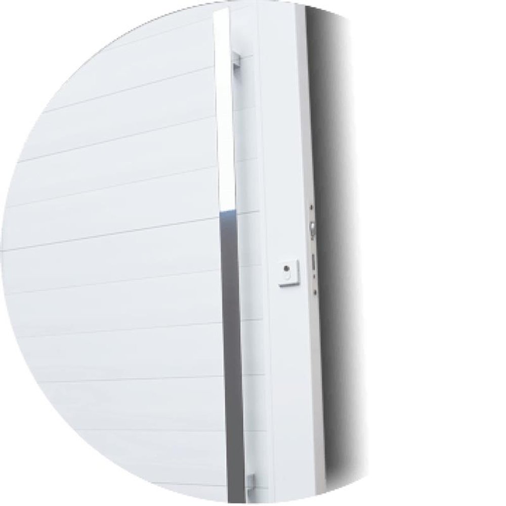 Porta Pivotante de PVC Linha Tecplus100 Branco 1 Folha de Abrir para o Lado Direito Lado Direito Vidro Liso Incolor 5mm Temperado Lambris de Alumínio Branco Puxador Milão 100 Cm Polido Altura 216 Cm Largura 120 Cm Requadro 6 Cm Cantos Soldados Reforços internos de Aço Zincado Arremate e demais acabamentos acompanham o produto Garantia de 5 anos contra defeitos de fabricação