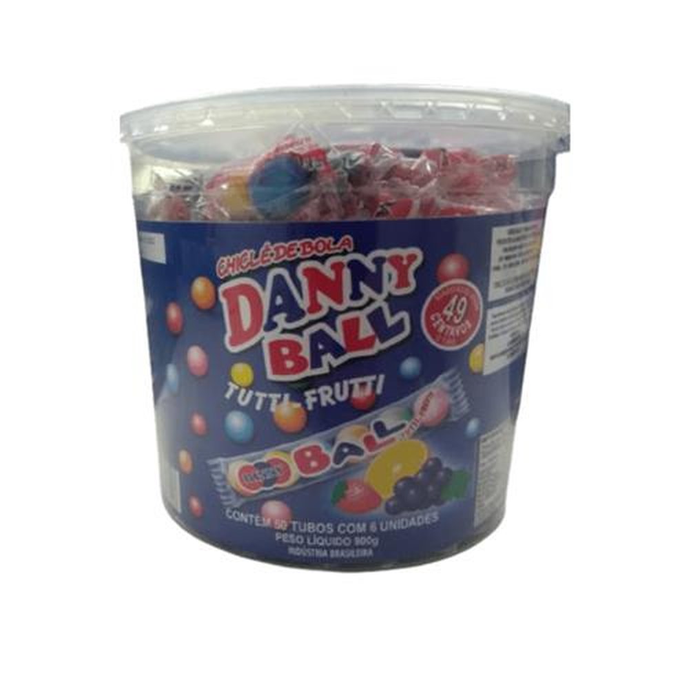 Pote de chicle danny ball com 50 tubos de 6 unidades sabor tutti-frutti.