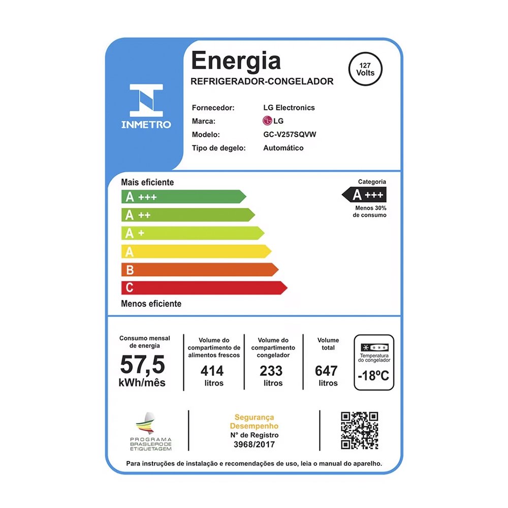 Geladeira/Refrigerador 2 Portas LG 647 Litros GC-V257SQV2 - A+++, Side By Side, Preto, Inox, 220V