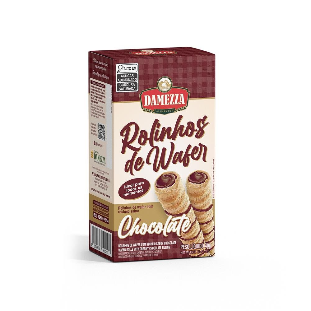 Rolinho recheado de chocolate 40g, embalagem em caixas de papelão contendo 25 unidades, medindo 360 x 205 x 140mm.