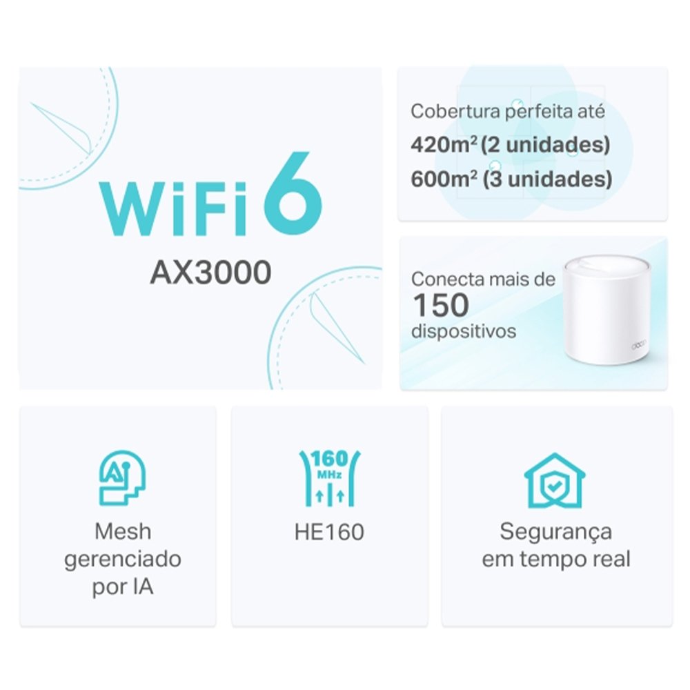 Descrição:- Wi-Fi 6 Dual Band AX3000- Maratone suas series favoritas em 4K com velocidade de ate 3000 Mbps (574 Mbps em 2,4 GHz e 2402 Mbps em 5 GHz)¿- Diversas opções de montagem - Montagem em Poste, Parede ou Mesa- Wi-Fi Externo de Qualidade - Resistência contra poeira e agua com classificação IP65*- Alimentado via Ethernet (PoE) - O cabo Ethernet transmite dados e energia, dispensando uma tomada proxima do equipamento- Porta Gigabit Ethernet - 2 × portas Ethernet Gigabit WAN/LAN proporcionam conexões cabeadas de alta velocidade§- Funciona com todos os Decos - Crie uma rede Mesh entre todos modelos Deco.- TP-Link HomeShield - Oferece proteção abrangente de rede, controles parentais completos e em tempo real**Especificações:WIRELESSPadrões:Wi-Fi 6IEEE 802.11ax/ac/n/a 5 GHzIEEE 802.11ax/n/b/g 2.4 GHzVelocidade de WiFi:AX30005 GHz: 2402 Mbps (802.11ax, HE160)2.4 GHz: 574Mbps (802.11ax)Alcance do sinal WiFi:Tecnologia TP-Link Mesh - O backhaul Ethernet opcional trabalha em conjunto para conectar as unidades Deco e fornecer cobertura continuaRede Mesh gerenciada por Inteligência Artificial - Aprende de forma inteligente o ambiente de rede para fornecer o Wi-Fi ideal para sua casa2× Antenas (Internas) - Varias antenas formam uma matriz de reforço de sinal para cobrir mais direções e grandes areasBeamforming - Concentra a força do sinal sem fio para os clientes para expandir o alcance do Wi-FiCapacidade WiFi:AltaDual Band - Distribua os dispositivos em diferentes bandas para obter o melhor desempenhoMU-MIMO - Comunica-se simultaneamente com varios clientes MU-MIMOOFDMA - Comunica-se simultaneamente com varios clientes WiFi 64 fluxos - Largura de banda mais do que suficiente para os dispositivos conectadosModos de OperaçãoRoteador, ponto de acessoHARDWAREPortas Ethernet:3 × portas Gigabit* Por Unidade DecoSuporta detecção automatica de WAN/LANDIMENSÕESDimensões: (W×D×H) 110 × 110 × 114 mmConteudo do Pacote2 unidades Deco X501 cabo Ethernet RJ452 adaptadores de energia1 Guia de Instalação Rapida. Garantia: 12 meses.