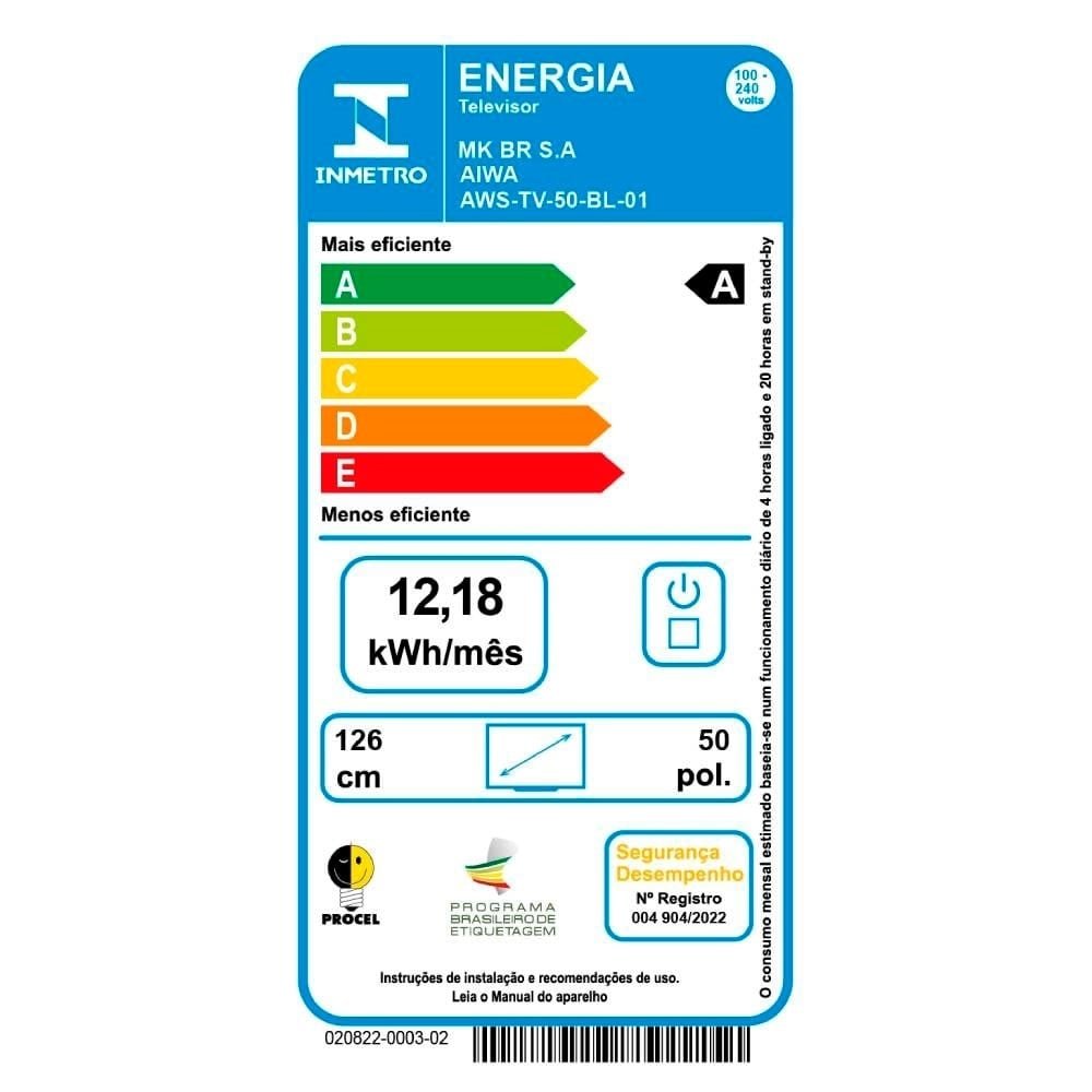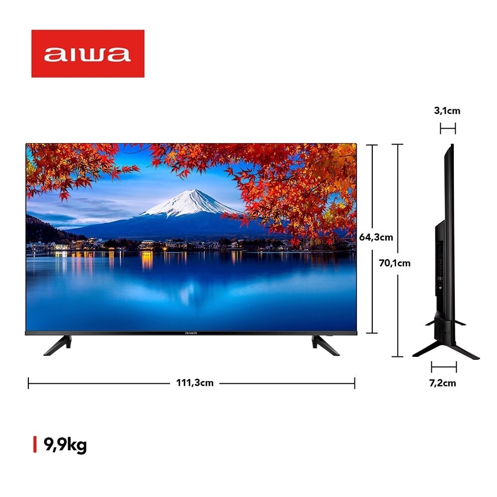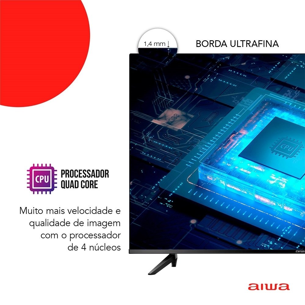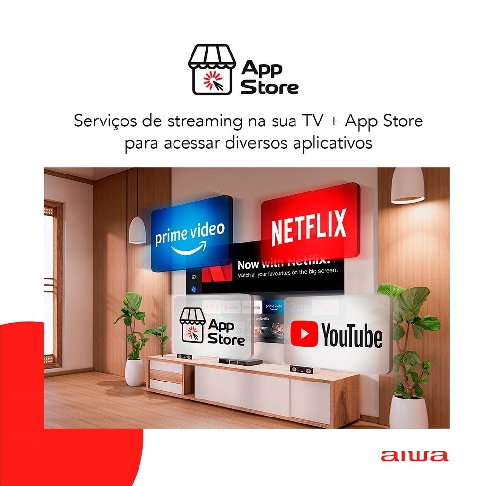 Smart TV 50¿ 4K D-LED Aiwa IPS Wi-Fi Bluetooth Com resolução 4K e tecnologia HDR10 frequência de 60Hz, que proporcionam imagens em alta definição, com aprimoramento de cores, contraste e imagens mais próximas da vida real. Além disso, tenha experiência de som surround com a tecnologia Dolby áudio. Som de cinema na sua casa! Assista a Netflix, Amazon Prime e Youtube, e acesse a APP STORE para acessar diversos aplicativos na sua Smart TV. Blue protect, a tecnologia reduz em até 90% a emissão de ondas de luz azul. A luz azul tem efeitos que prejudicam os olhos e causam cansaço visual. Garanta mais proteção e conforto para a sua visão e da sua família! A TV tem borda ultrafina de 1,4mm e proporciona, além de design sofisticado e elegante, uma imersão visual impressionante. O processador quad-core de quatro núcleos proporciona mais velocidade e qualidade de imagem para que você possa ver os seus conteúdos favoritos. Para completar ela conta com sistema operacional Linux 5.3, 3-HDMI, 2-USB, 1-Saída óptica e Wi-Fi. Marca Aiwa