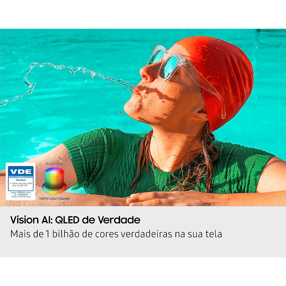 * Vision AI: QLED de Verdade: A Tecnologia de Pontos Quânticos garante que seus conteúdos tenham 100% do volume de cor, ressaltados com naturalidade através de uma camada de cristais associada ao Color Booster com AI. Tudo isso na primeira linha de TVs certificada pela PANTONE, referência mundial em especificação de cores. Além disso, é um produto sem cádmio em sua composição, um metal pesado danoso à saúde e ao meio ambiente.