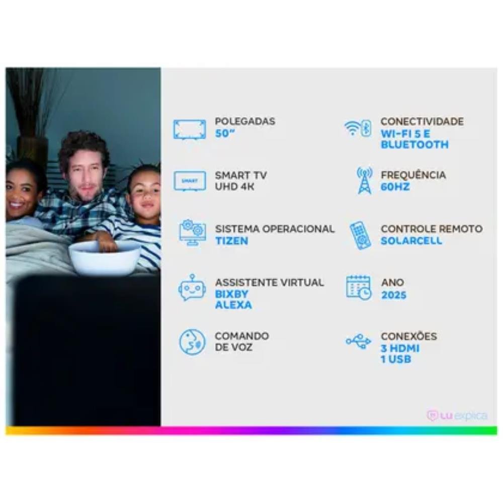 Experimente a definição do 4K com o Crystal Processor 4K e tecnologias como HDR10+, Motion Xcelerator e PurColor. Áudio imersivo com OTS Lite e Q-Symphony, plataforma Tizen OS com atualizações por 7 anos, Xbox Cloud Gaming, canais gratuitos via Samsung TV Plus e assistentes de voz integrados (Bixby e Alexa). Tudo isso com a segurança do Samsung Knox, design moderno e garantia nacional. A escolha inteligente em tecnologia e economia!