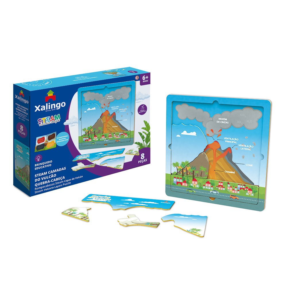 Para educar enquanto diverte, o Quebra-cabeça Camadas do Vulcão, da linha STEAM da Xalingo Brinquedos, possibilita a montagem de um quebra-cabeça com as suas 8 peças em madeira reflorestada, mostrando cada camada do Vulcão. A criança terá experiências divertidas e aprendizados incríveis sobre as diferentes camadas e suas características! _x000D_