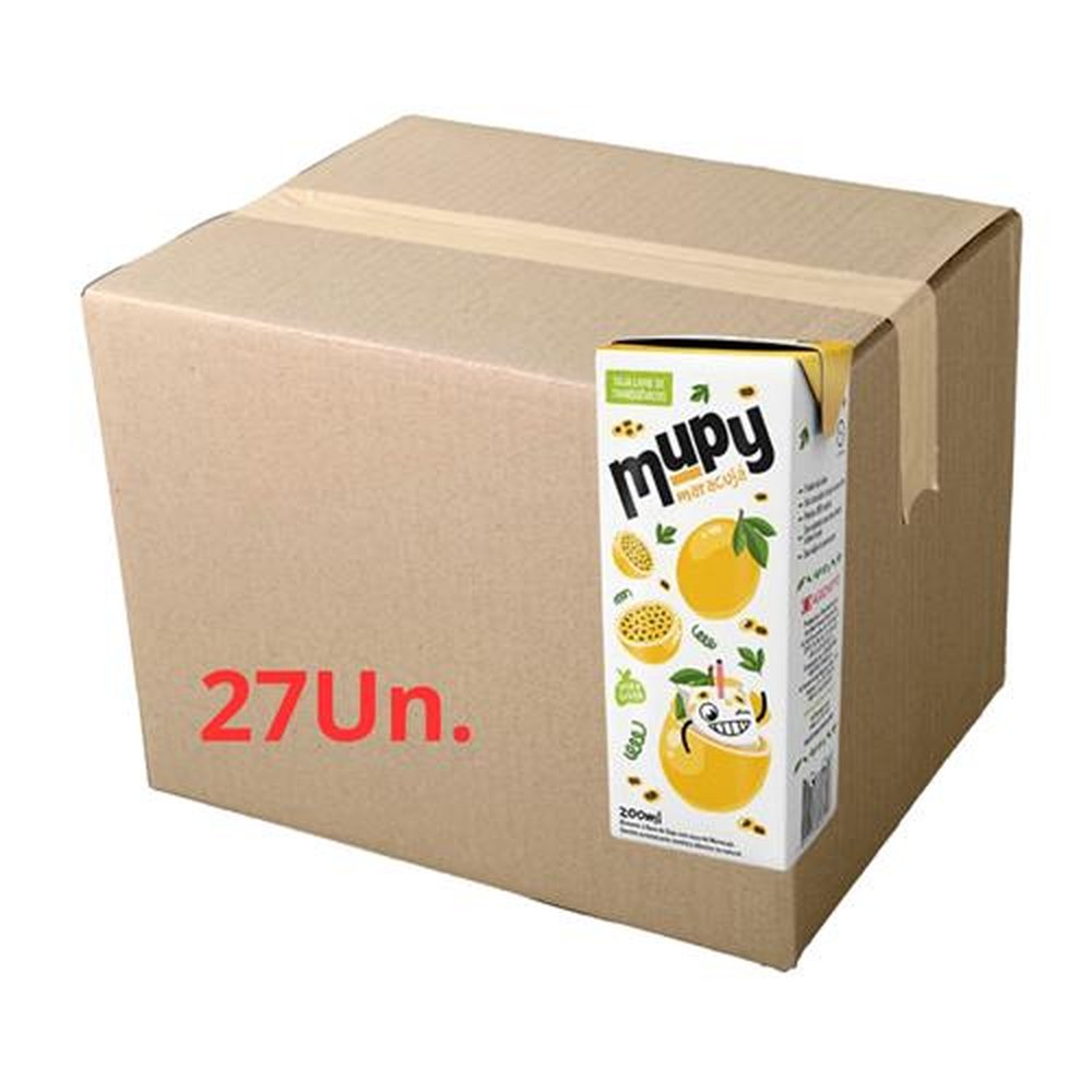 MUPY é um alimento à base de soja + suco de fruta prontinho pra beber a qualquer momento. Caixa com 27 unidades de 200ml, sabor maracujá.