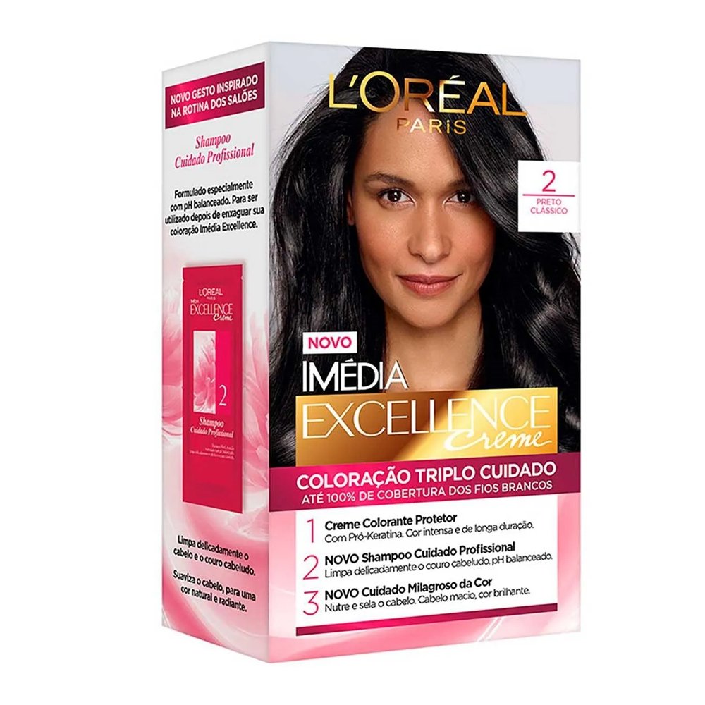 A Tintura L¿Oréal Imédia Excellence Creme Preto oferece uma coloração intensa, uniforme e duradoura, garantindo 100% de cobertura dos fios brancos com resultado profissional. Sua tecnologia avançada com tripla proteção age antes, durante e depois da coloração, fortalecendo os cabelos e deixando-os até 85% mais resistentes. O kit completo traz o creme colorante protetor, o shampoo cuidado profissional e o cuidado milagroso da cor, que juntos mantêm os fios nutridos, brilhantes e com toque sedoso. Ideal para quem busca um preto profundo e elegante, o produto proporciona cor poderosa, brilho espelhado e aparência saudável, valorizando a beleza natural com segurança e eficiência.