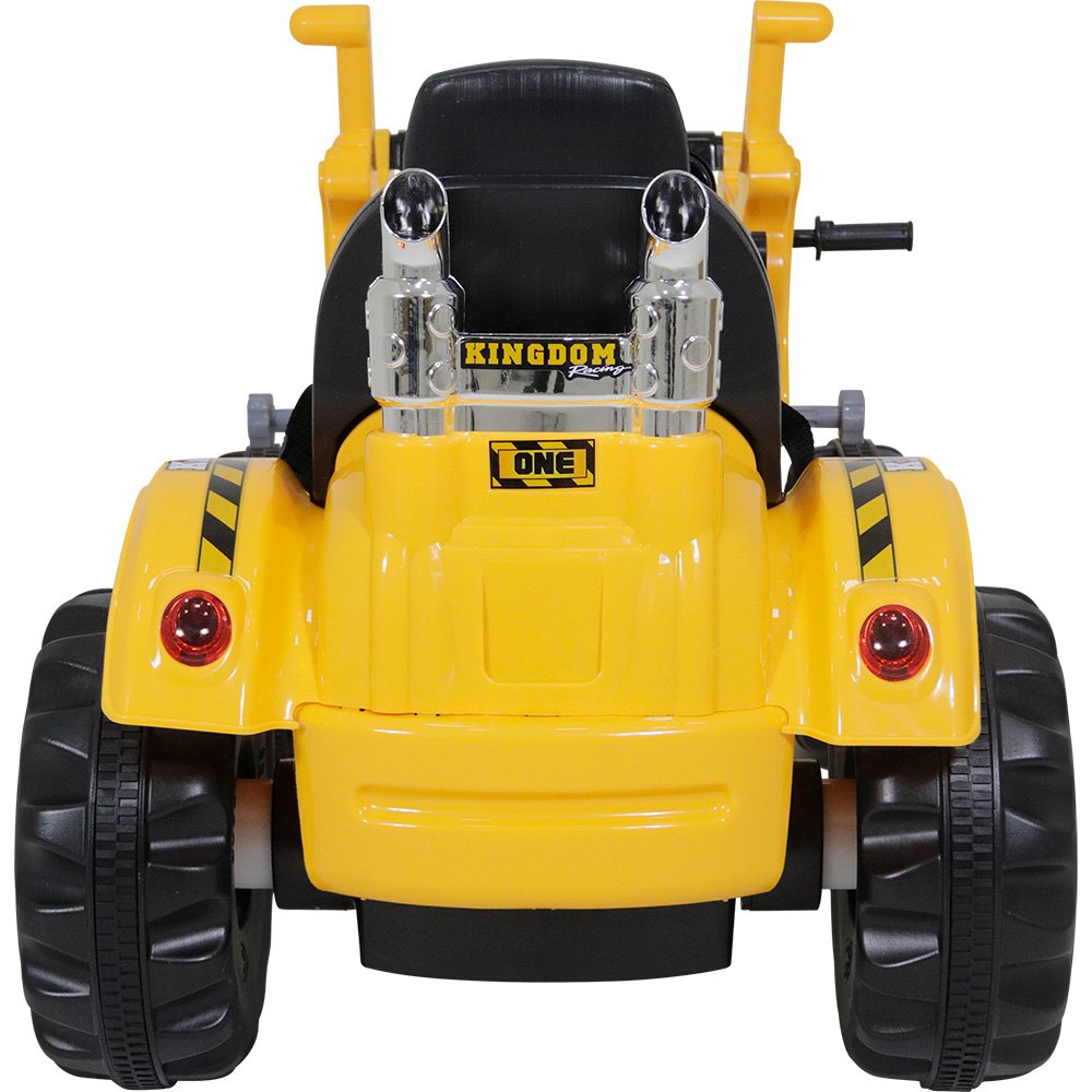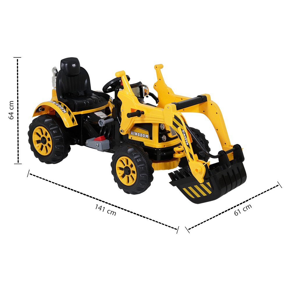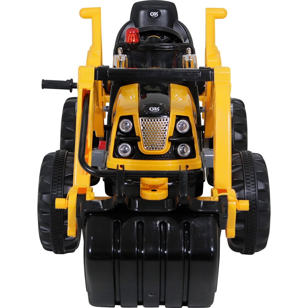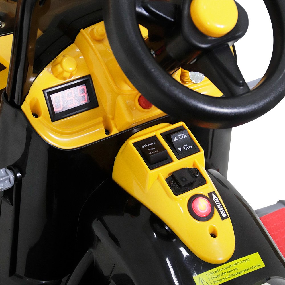 O Trator Retroescavadeira Amarelo possui volante com botão para buzina e seu painel conta com entrada para MP3, voltímetro digital que marca o percentual de uso da bateria, botões de liga/desliga, buzina, música e volume, além de botão frente/ré. Seu assento é de plástico, possui pedal para acelerar e cinto de segurança de 2 pontas para prender a criança.