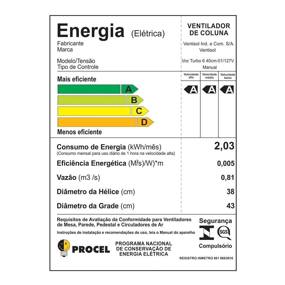 Ventilador de Coluna Ventisol 40cm Turbo 6, 3 Velocidades, 6 Pás, Preto, 110V