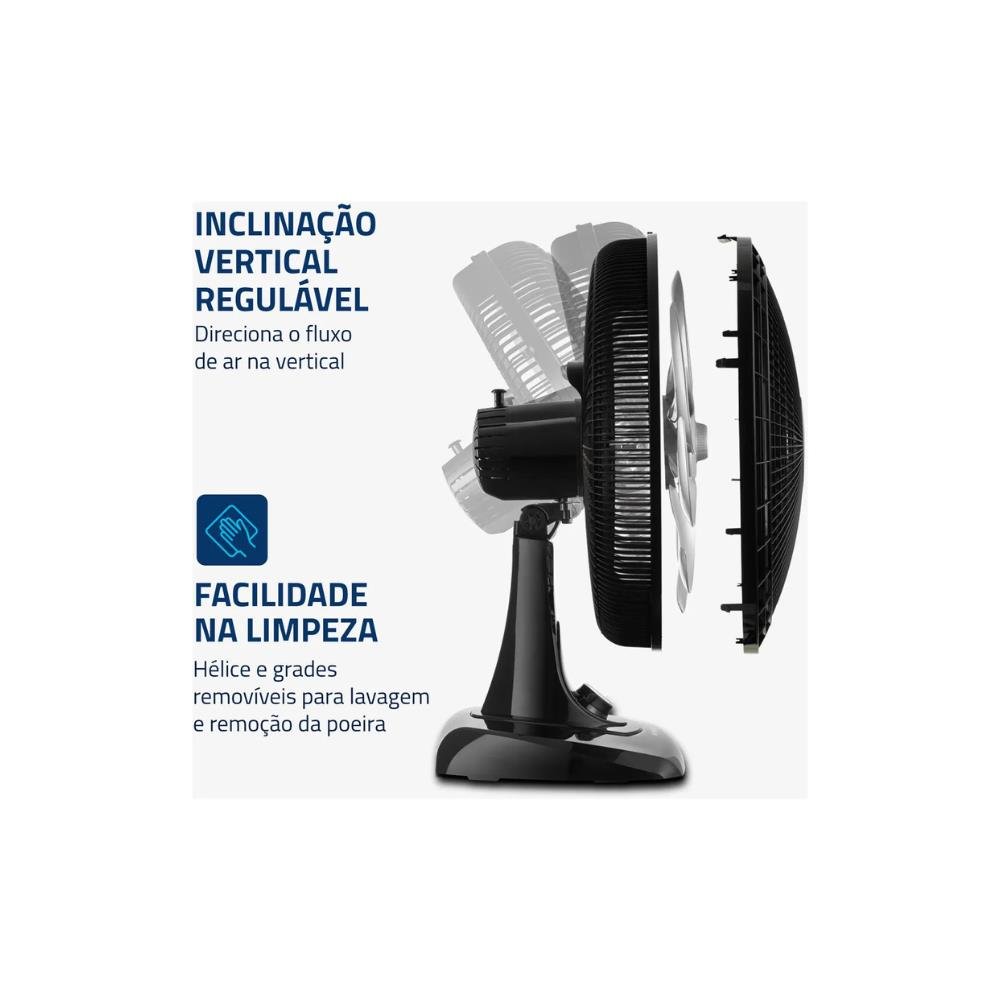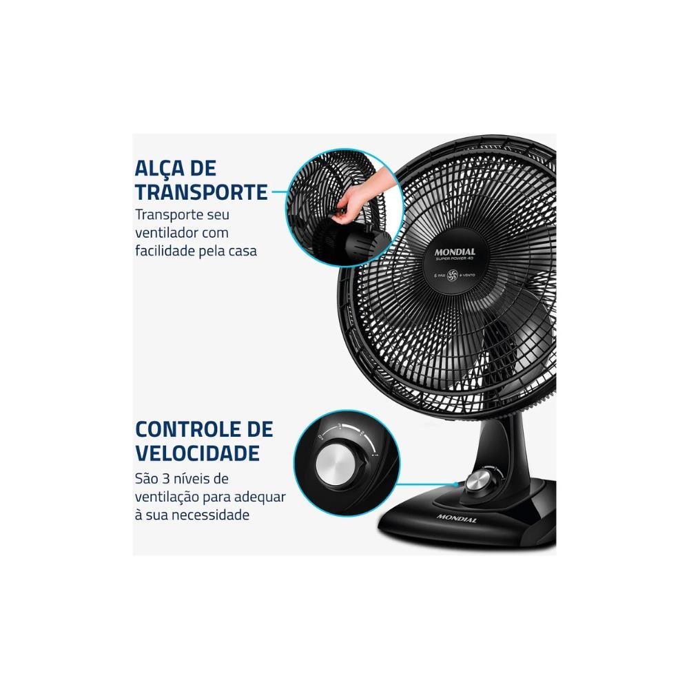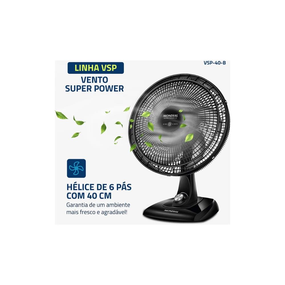 O ventilador Super Power VSP-40 possui 40 cm de diâmetro e hélice com 6 pás, garantindo um ambiente mais refrescante e agradável. Já o sistema de ventilação da Mondial apresenta baixo nível de ruído e assegura o silêncio necessário para momentos de concentração e uma excelente noite de sono. Saiba mais sobre o VSP-40: VENTO SUPER POWER: A linha de Ventiladores Super Power possui 40cm de diâmetro e 6 Pás. O design, aliado à potência, promove maior intensidade do vento e é garantia de um ambiente fresco e agradável. MAIS SILÊNCIO E CONFORTO: O sistema de ventilação da Mondial apresenta baixo nível de ruído, assegurando o silêncio necessário para momentos de concentração e uma excelente noite de sono. MAIOR DISTRIBUIÇÃO DE AR: O Sistema Oscilante Contínuo amplia o raio de alcance do vento no ambiente, permitindo uma distribuição de ar mais eficiente nos cômodos da casa. INCLINAÇÃO VERTICAL REGULÁVEL: Para um direcionamento ideal do fluxo do ar. CONTROLE DE VELOCIDADE: As 3 opções de velocidade permitem adequar o vento à sua necessidade: Máxima Turbo, Média Conforto e Mínima Silencioso. FACILIDADE NA LIMPEZA: A grade frontal removível oferece mais facilidade na limpeza das hélices, o que simplifica a lavagem e a remoção de poeira, e garante melhor qualidade do ar. ALÇA DE TRANSPORTE + PORTA-FIO: Além do design compacto, a alça traseira permite que o ventilador seja transportado entre os cômodos da casa com facilidade. Com o porta-fio embutido, você armazena o fio elétrico dentro do aparelho após o uso. UM ANO DE GARANTIA MONDIAL: A Mondial é a escolha de milhões de consumidores. Mondial, a escolha inteligente.