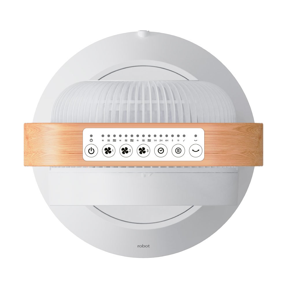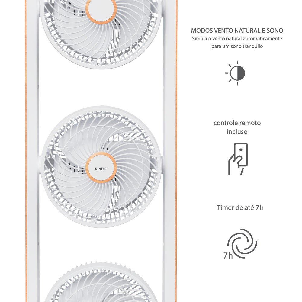 Ventilador Triplo SPIRIT Robot Branco-Caramelo. Design com três turbinas independentes, controle remoto com fixação magnética e funções Bom Sono e Vento Natural. Potência de 130W e textura amadeirada cerejeira.
