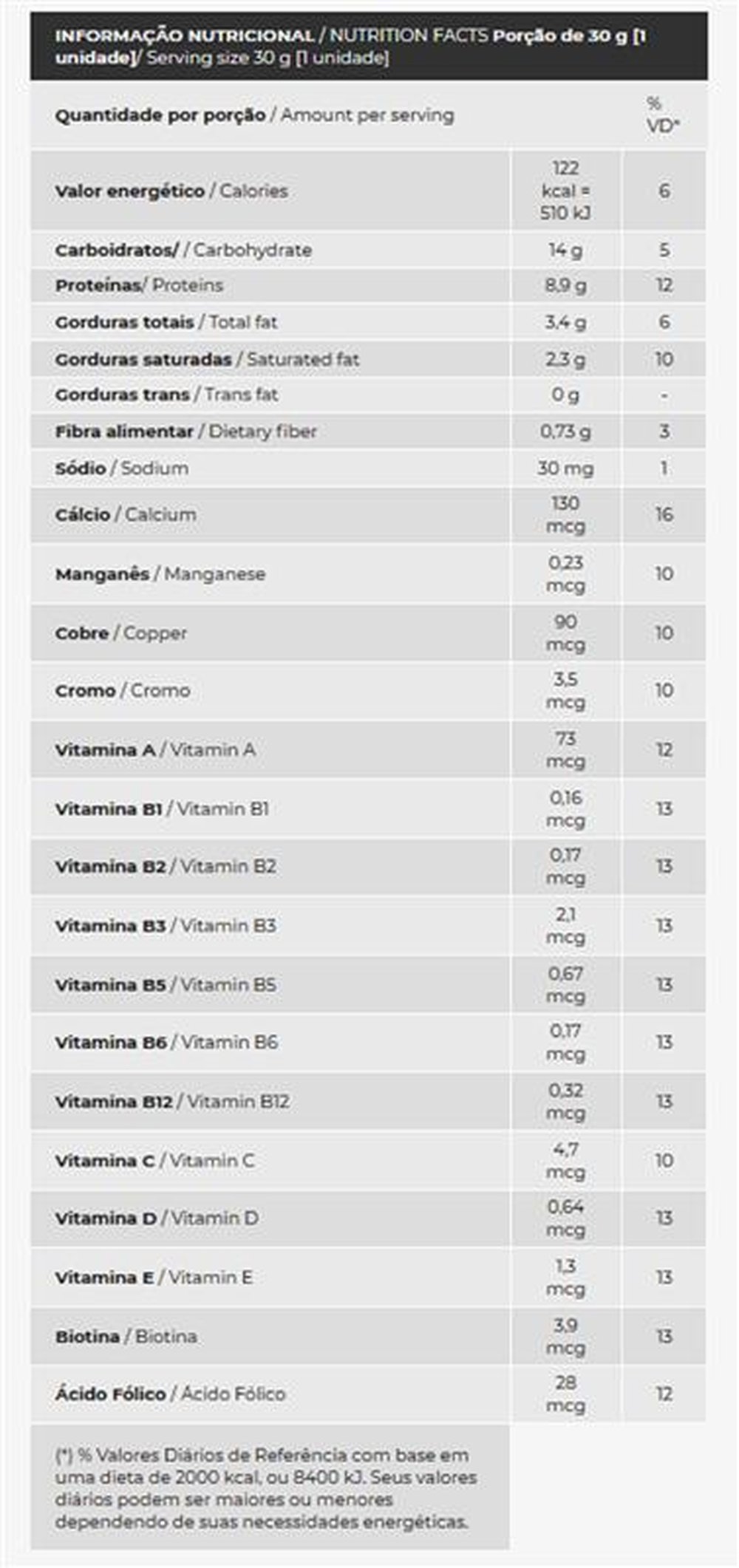 Proteína concentrada do leite, xarope de maltitol, xarope de frutose, cobertura sabor chocolate ao leite, colágeno hidrolisado, óleo de palma, caseinato de cálcio, fruto-oligossacarídeo, proteína isolada do soro de leite, mix de vitaminas [A (palmitato de retinol), ácido fólico (ácido fólico), C (ácido ascórbico), H (biotina), E (acetato de tocoferol), D (colecalciferol), B5 (pantotenato de cálcio), B12 (cianocobalamina), B1 (tiamina mononitrato), B2 (riboflavina) e B6 (piridoxina)], cloreto de sódio, mix de minerais [manganês, cromo e cobre], glicerina (umectante), aroma artificial, lecitina de soja (emulsificante), ácido cítrico (acidulante), sorbato de potássio (conservante) e bordeaux (corante artificial). NÃO CONTÉM GLÚTEN. DIABÉTICOS: CONTÉM FRUTOSE. ALÉRGICOS: CONTÉM SOJA E LACTOSE.