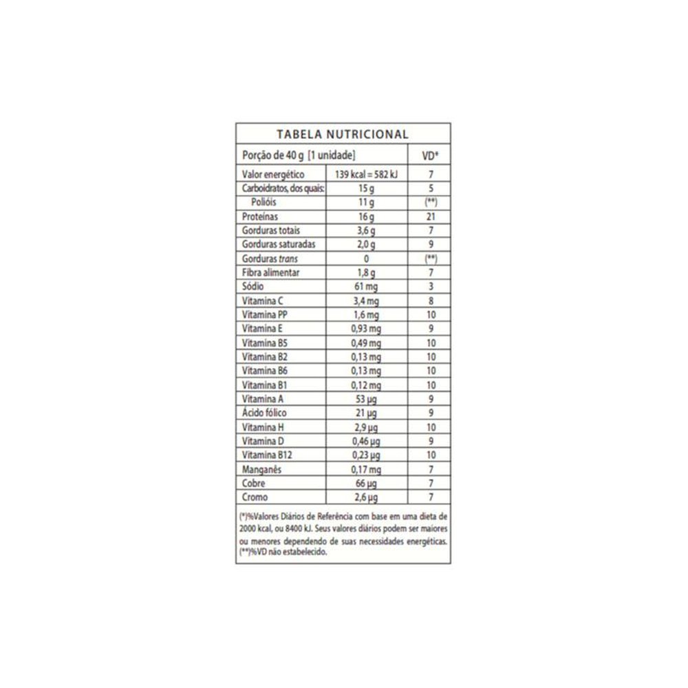 Blend proteico [proteína isolada do soro de leite, caseinato de cálcio, proteína hidrolisada (colágeno)], xarope de maltitol, cobertura de chocolate ao leite sem açúcar, xarope de polidextrose, óleo de palma, mix de vitaminas [vit. C (ácido ascórbico), vit. B3 (nicotinamida), vit. E (acetato de tocoferol), vit. B5 (pantotenato de cálcio), vit. B2 (riboflavina), vit. B6 (piridoxina), vit. B1 (tiamina mononitrato), vit. A (palmitato de retinol), ácido fólico (ácido fólico), vit. H (biotina), vit. D (colecalciferol) e vit. B12 (cianocobalamina)], cloreto de sódio, mix de minerais [manganês (sulfato de manganês), cobre (sulfato de cobre) e cromo (dinicotinato glicinato de cromo)], glicerina (umectante), lecitina de soja (emulsificante), aroma idêntico ao natural, ácido cítrico (acidulante), sorbato de potássio (conservante) e corante artificial bordeaux. Não contém glúten. Contém lactose. Alérgicos: contém derivados de leite e soja. Contém aromatizante sintético idêntico ao natural. Colorido artificialmente.